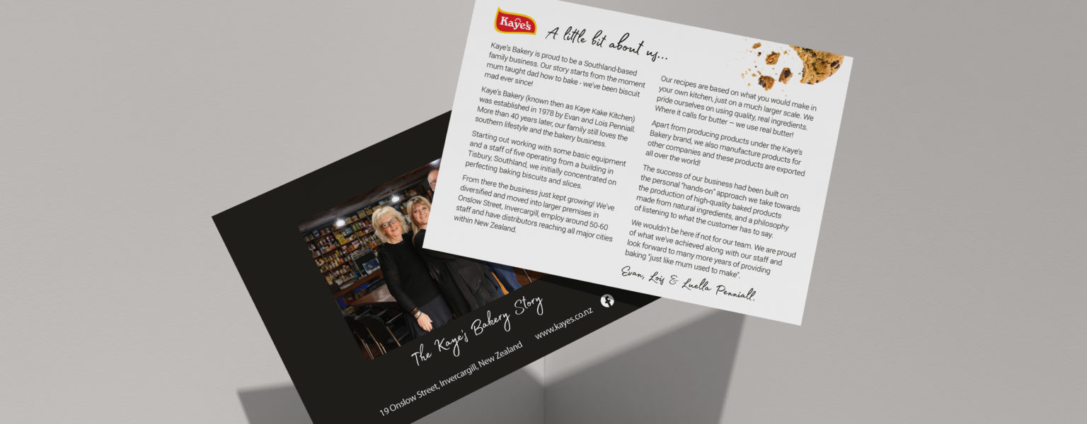 Along the way, we’ve maintained their website and spruced up the Kaye’s Bakery history cards that are sent with online orders and tell the receiver about the family owned company. Maintaining their website had involved making small, but impactful changes that improve functionality and user experience while on the website. We also update their stock, take product images, and keep on top of their messaging.