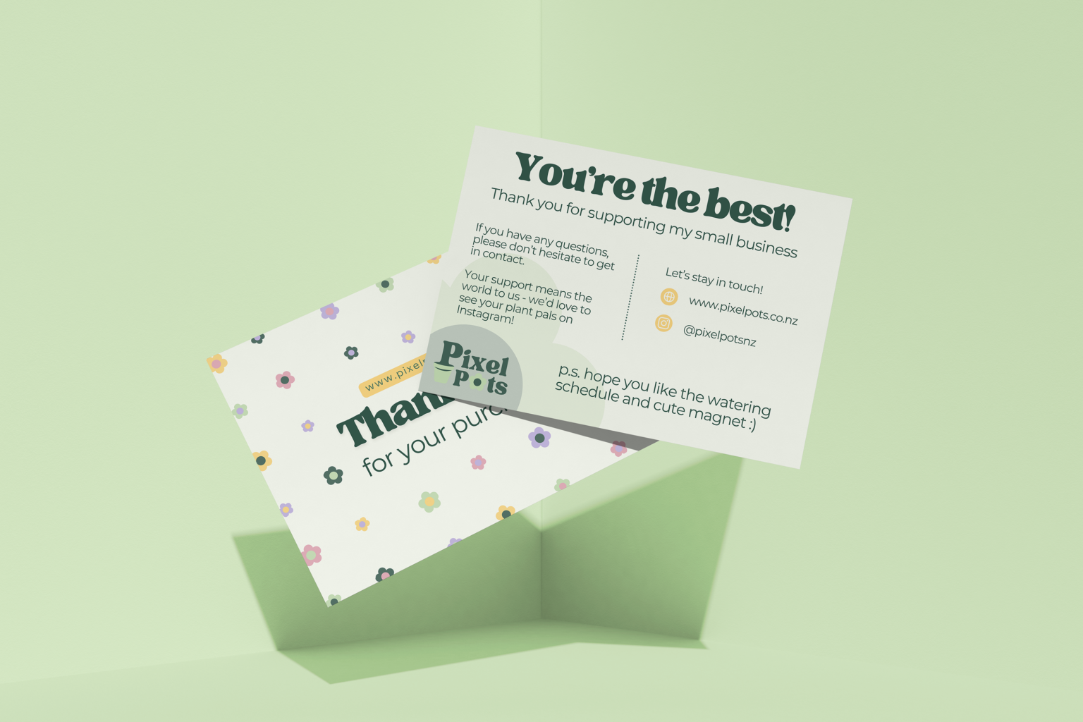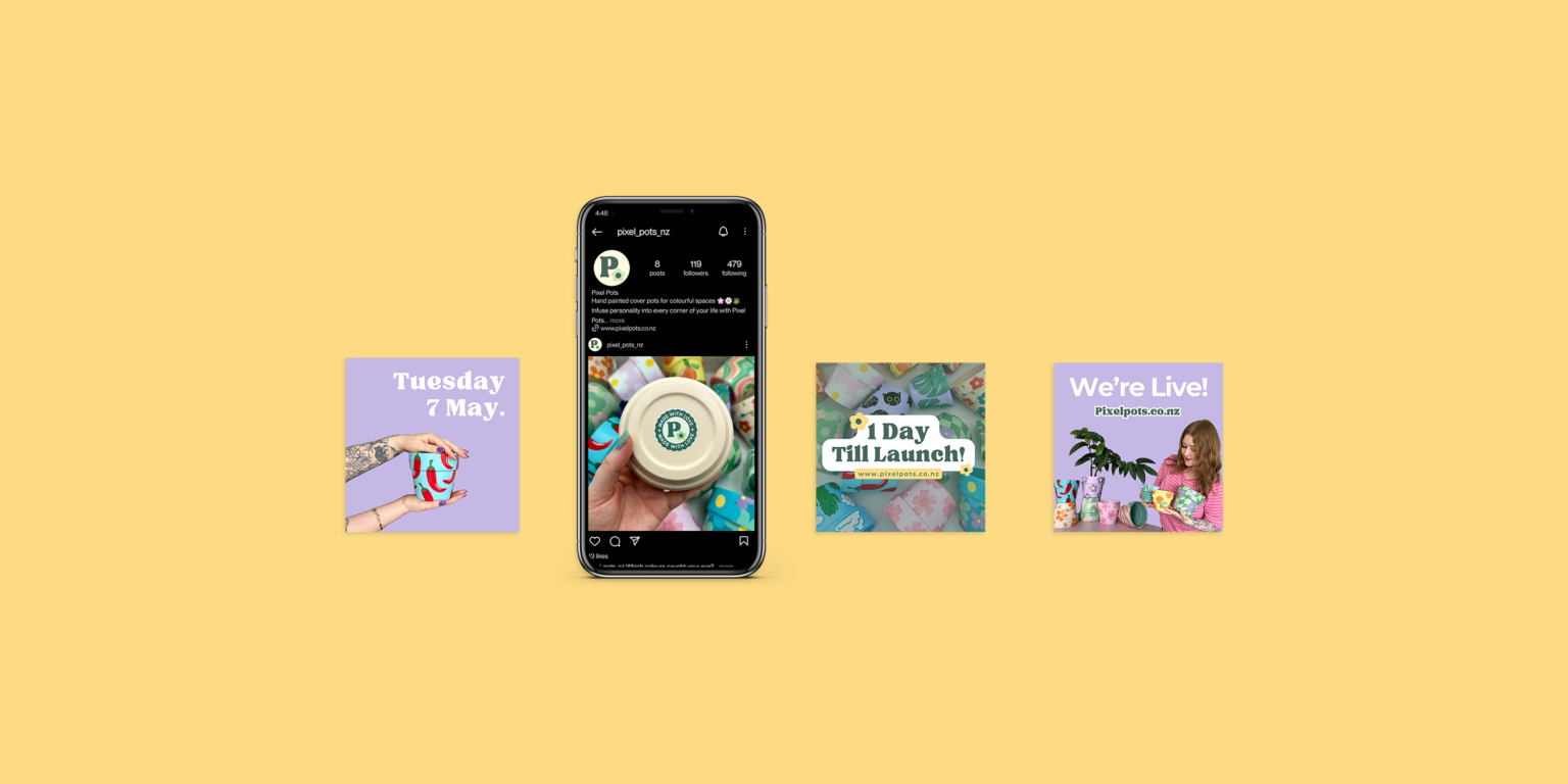 With Pixel Pot’s identity having taken shape, Kameron moved on to taking product photos and creating the website. She wanted it to really highlight the colours and patterns of the pots, so simple block colours and lots of space for images was a must. Using all the knowledge she is gaining from her Digital Marketing Diploma, Kameron pottered (haha) away with the site until it looked just as she’d imagined. Haylee got more than a few messages asking for feedback and opinions along the way.