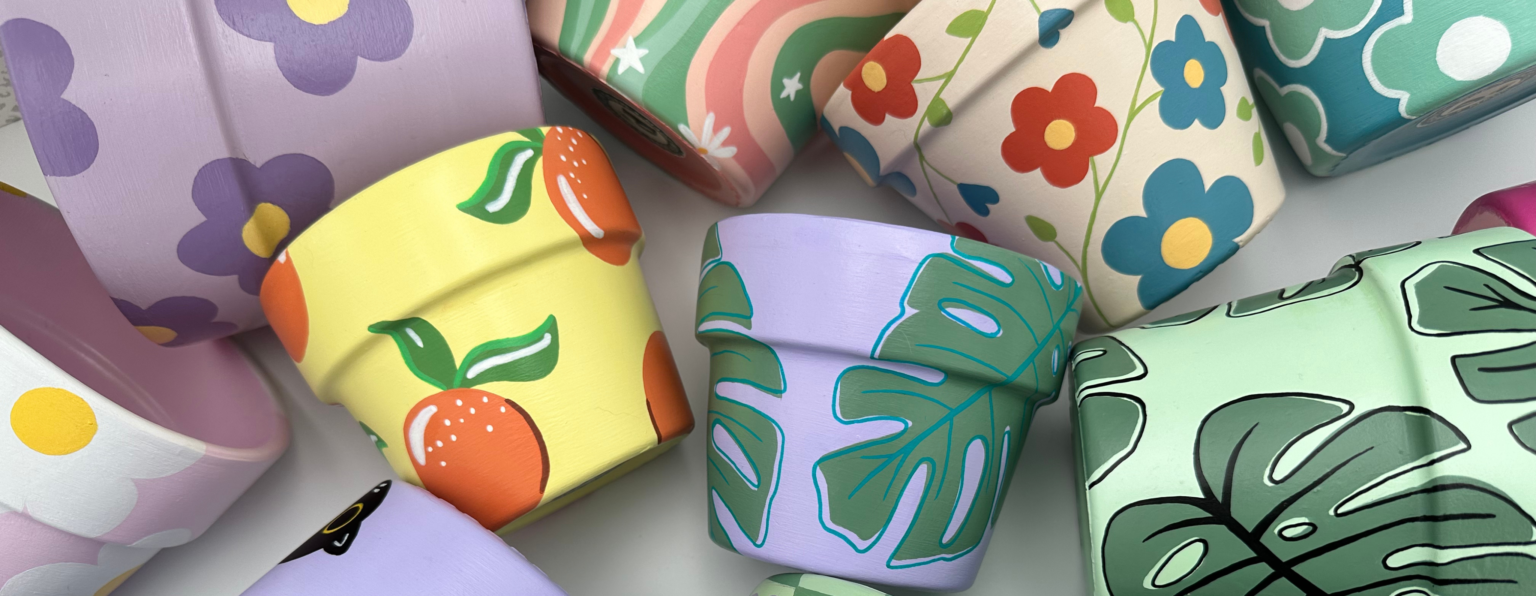 Pixel Pots is a unique little addition to our portfolio as it’s the new side hustle of our very own blossoming creative, Kameron. Creating Pixel Pots was a chance to put all she has learned through training and study to the test. After struggling to find cute and colourful pots for her houseplants, she had a bit of a eureka moment when she realised there are no rules against painting pots yourself. Pixel Pots are hand-painted terracotta plant pots which Kameron designs and paints right from the comfort of her living room.